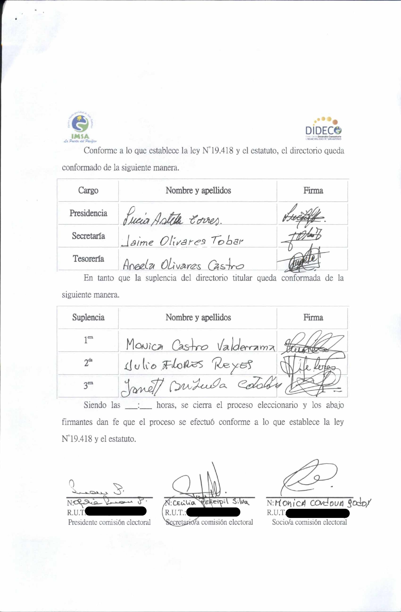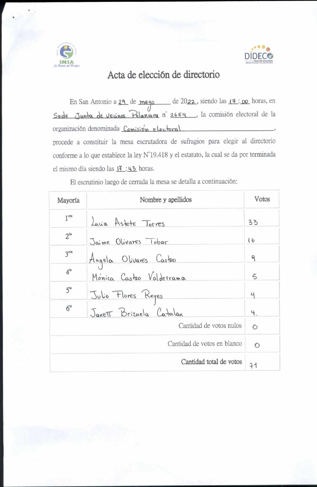 Acta de elección "Comisión Electoral Pelancura"