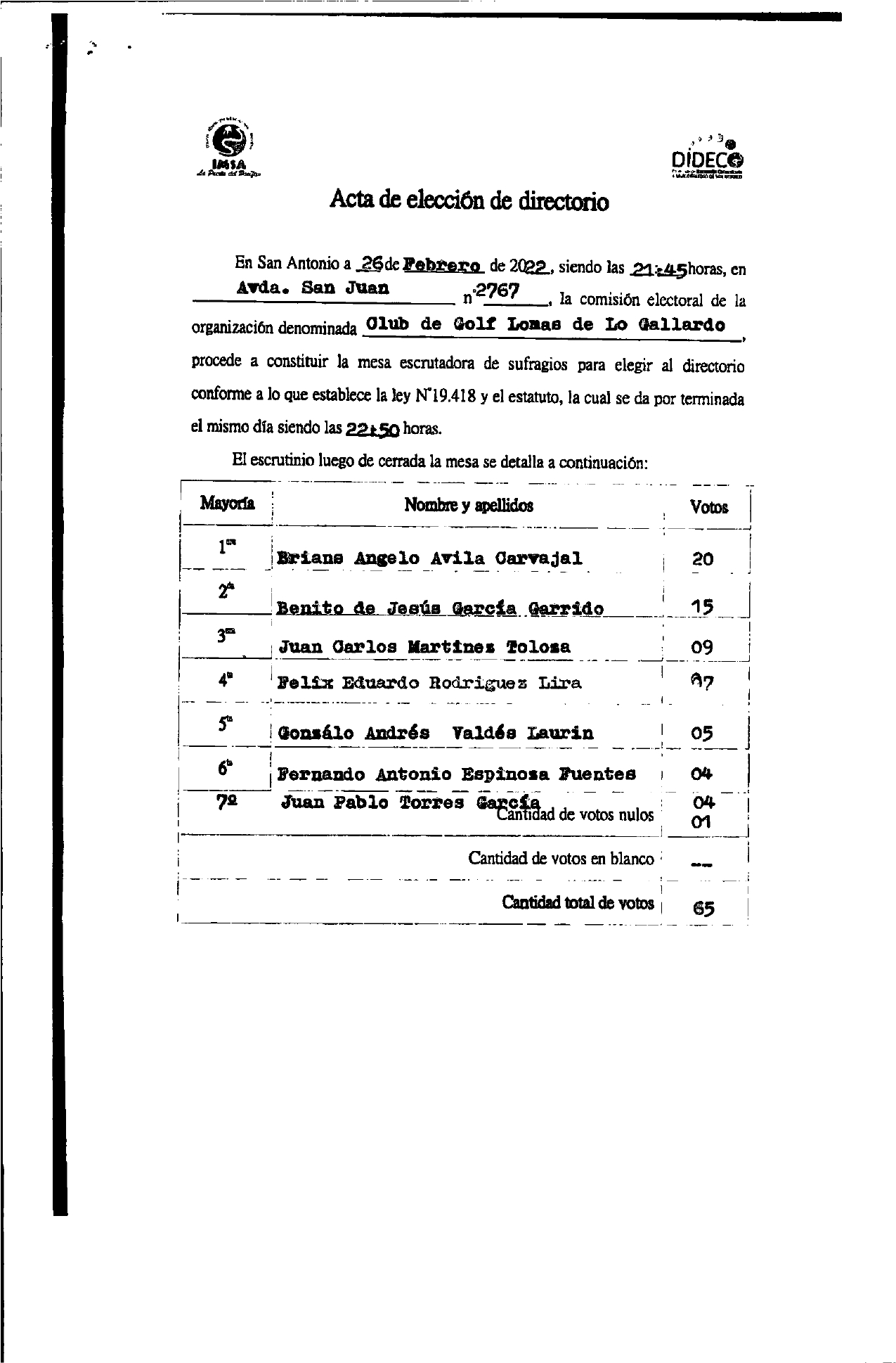 Acta de elección "club de Golf Lomas de Lo Gallardo"