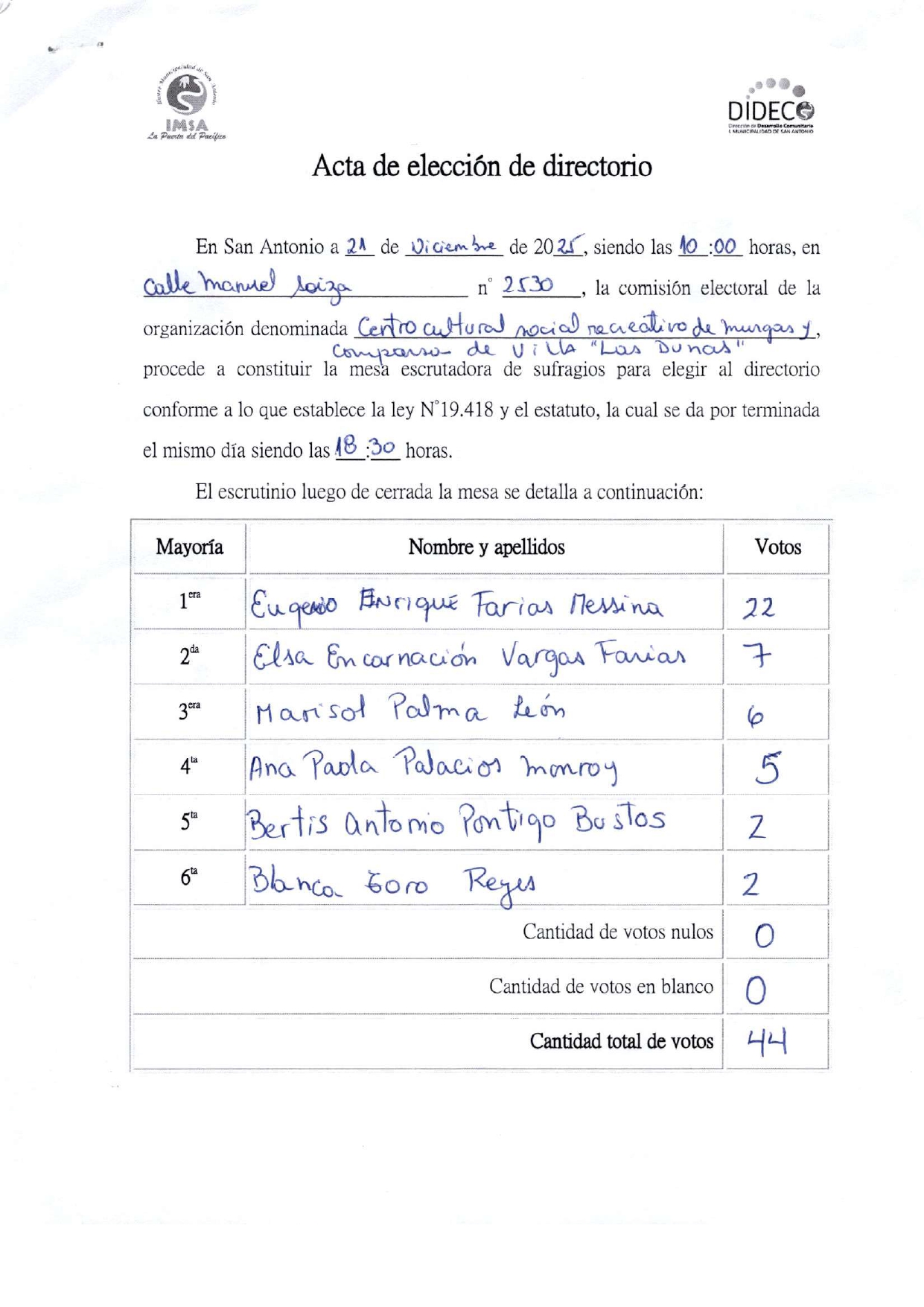 Acta de elecciones MURGA Y COMPARSA VILLA LAS DUNAS