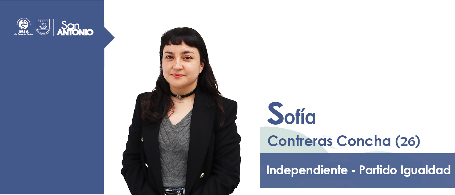 Sofía Isabel Contreras Concha (26), es sanantonina, oriunda de la población 30 de marzo. Egresó de enseñanza media del liceo Juan Dante Parraguez y cursó sus estudios superiores en Derecho en la Universidad de Valparaíso, por lo que recalca que la motiva fortalecer y defender la educación pública.