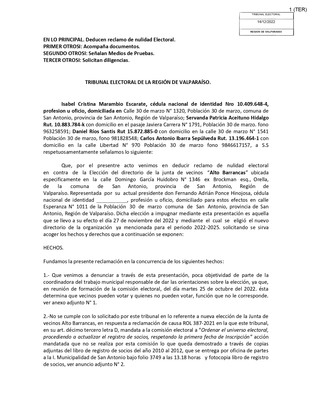 Reclamación de elección de directorio de la organización comunitaria Junta de Vecinos Alto Barrancas