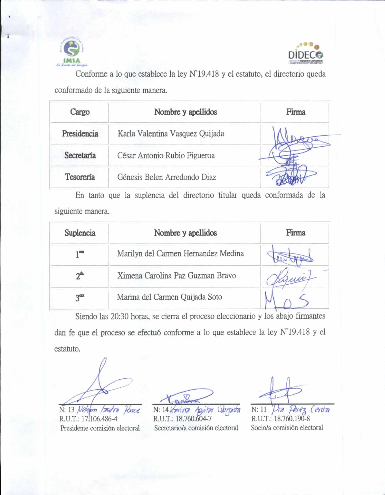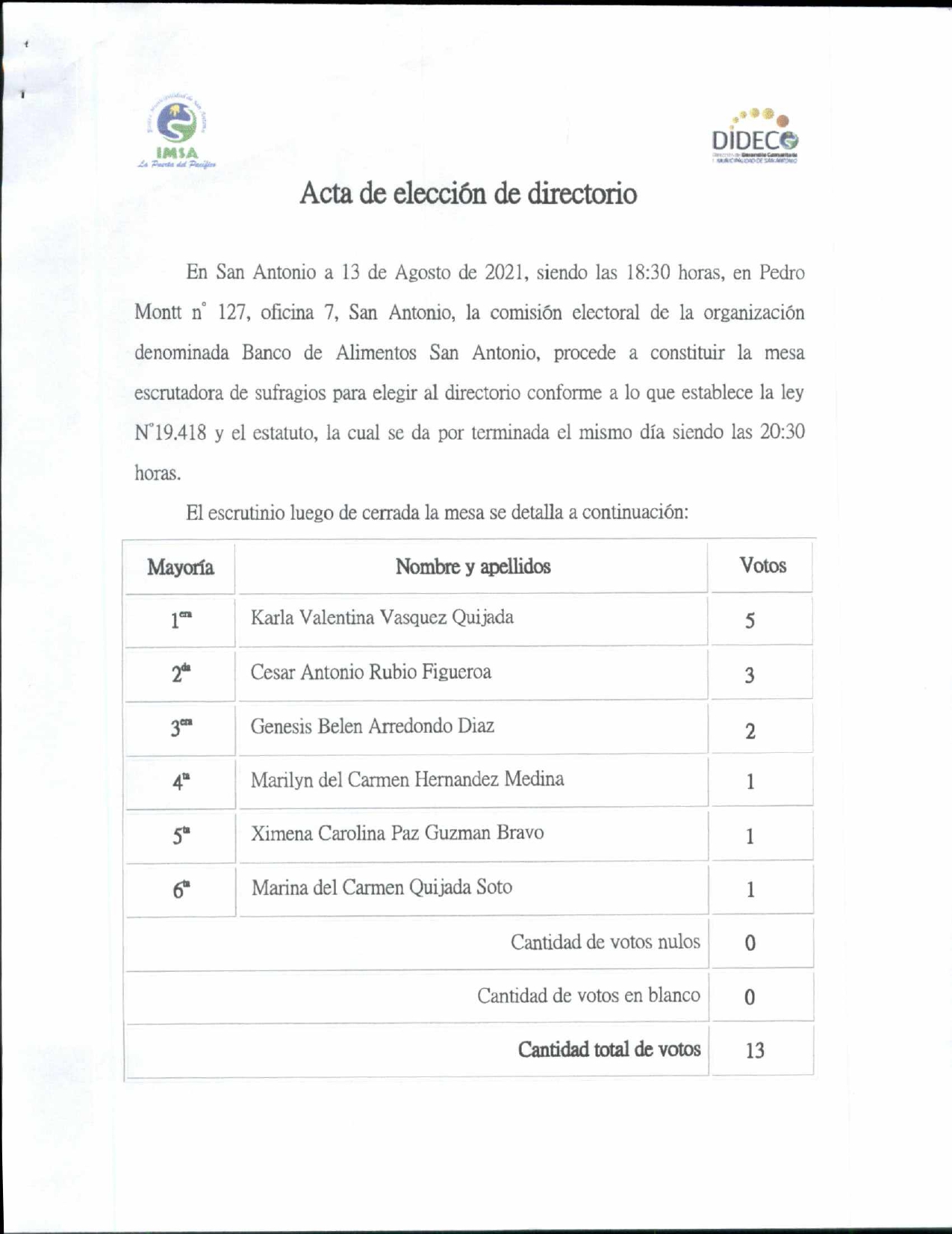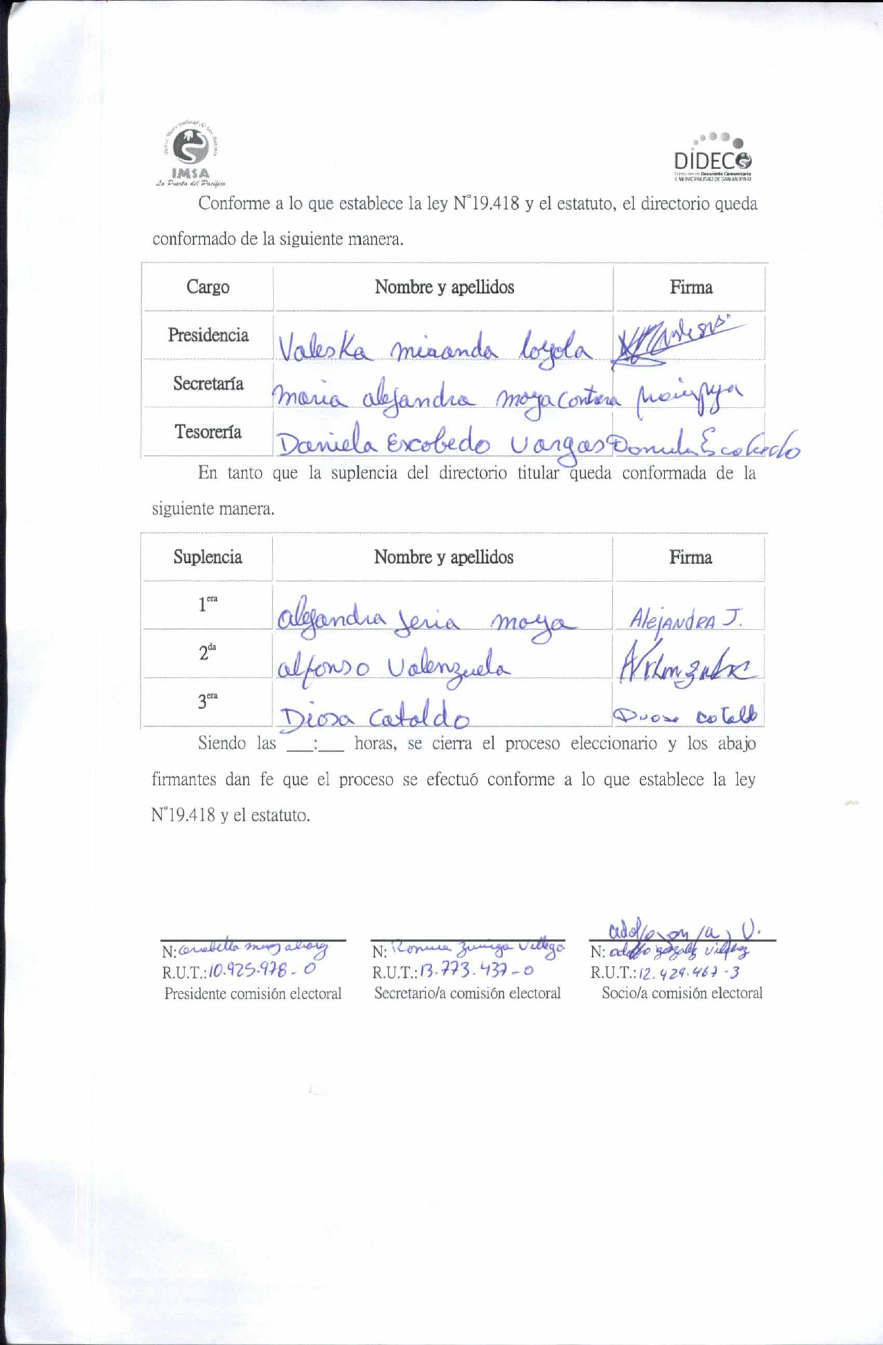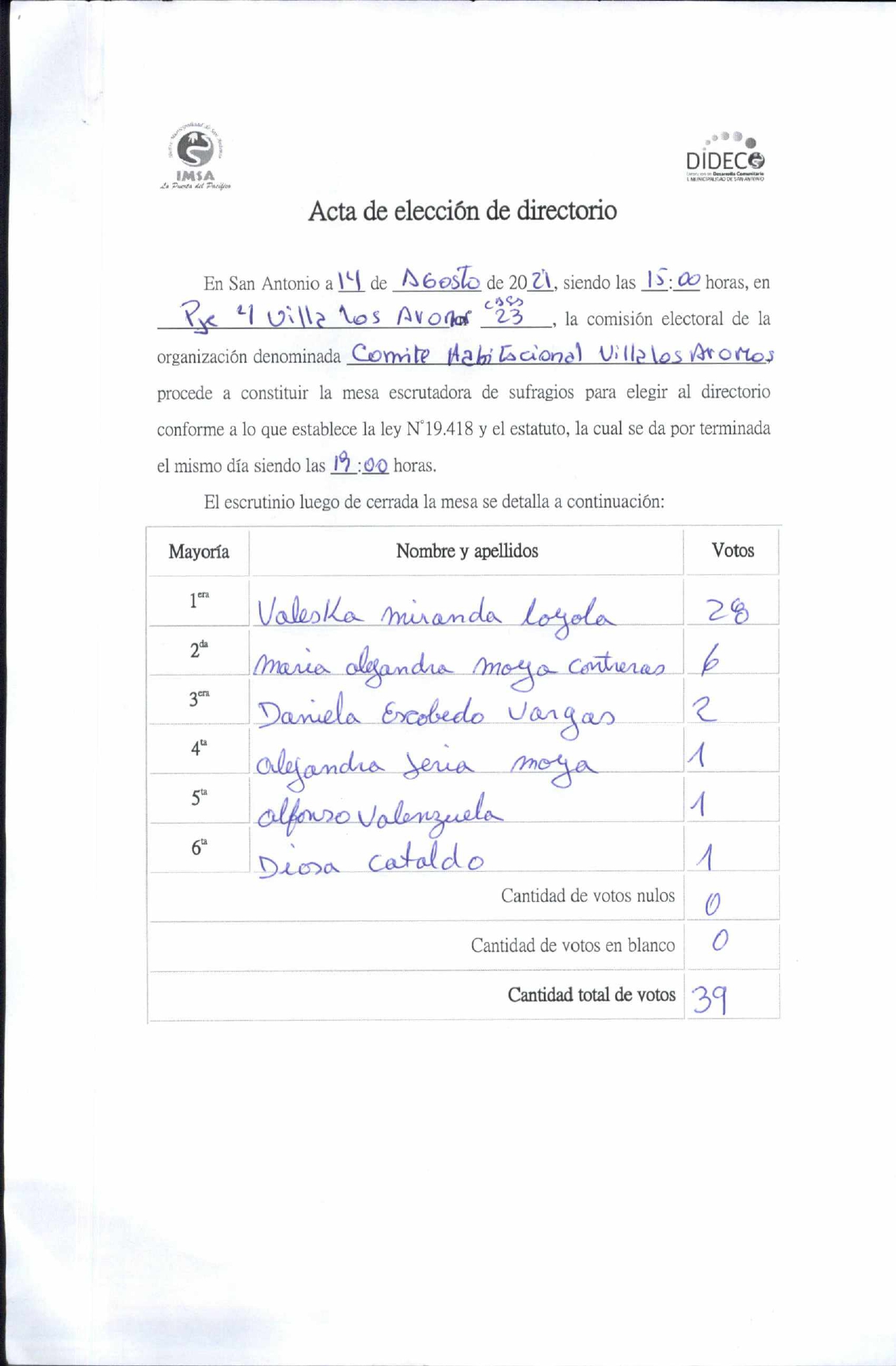 Acta de elección directorio Agrupación Social para El Desarrollo del Mirador del Maipo