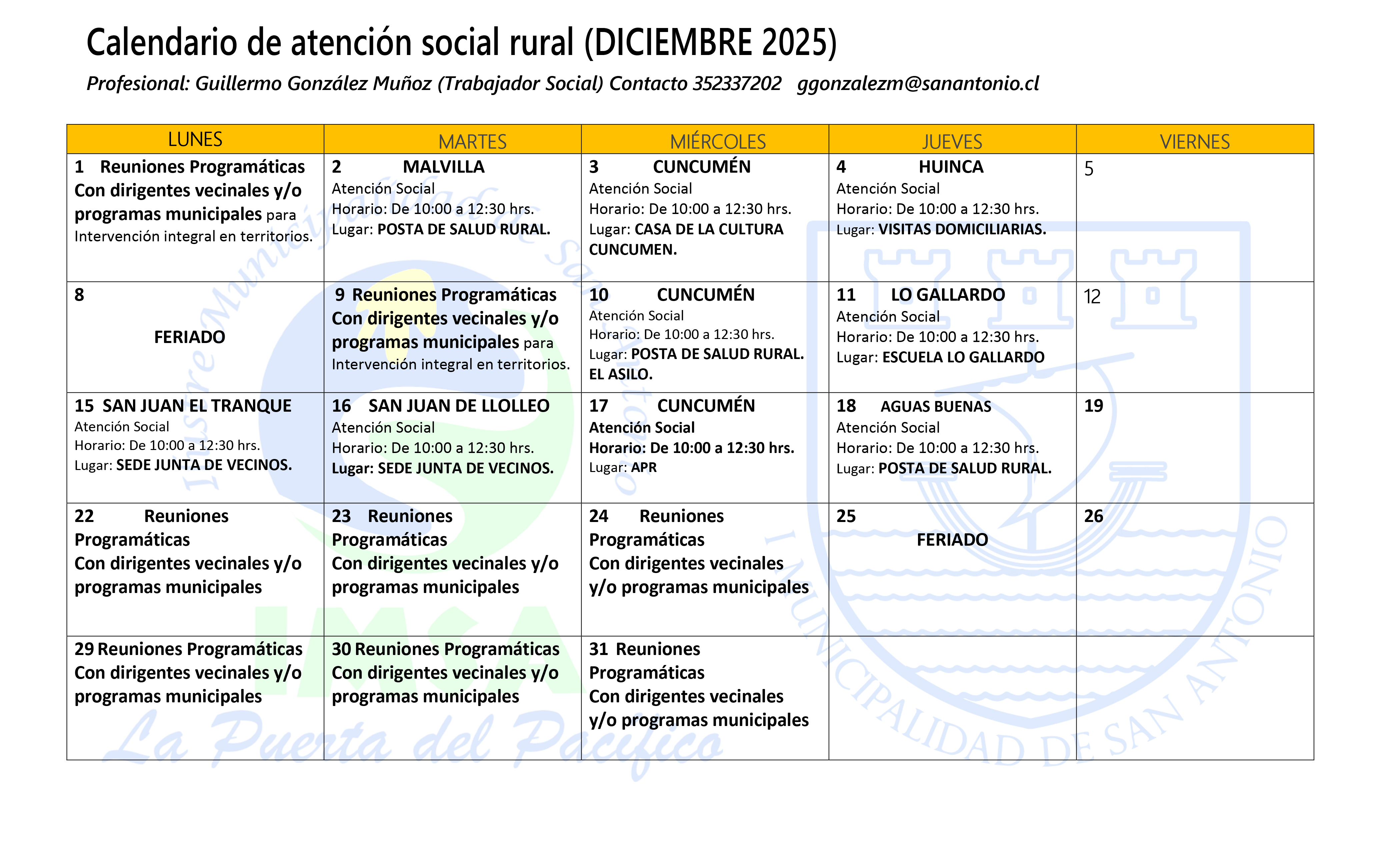 Lunes a jueves (jornada de mañana). Atenciones extraordinarias según contingencia.